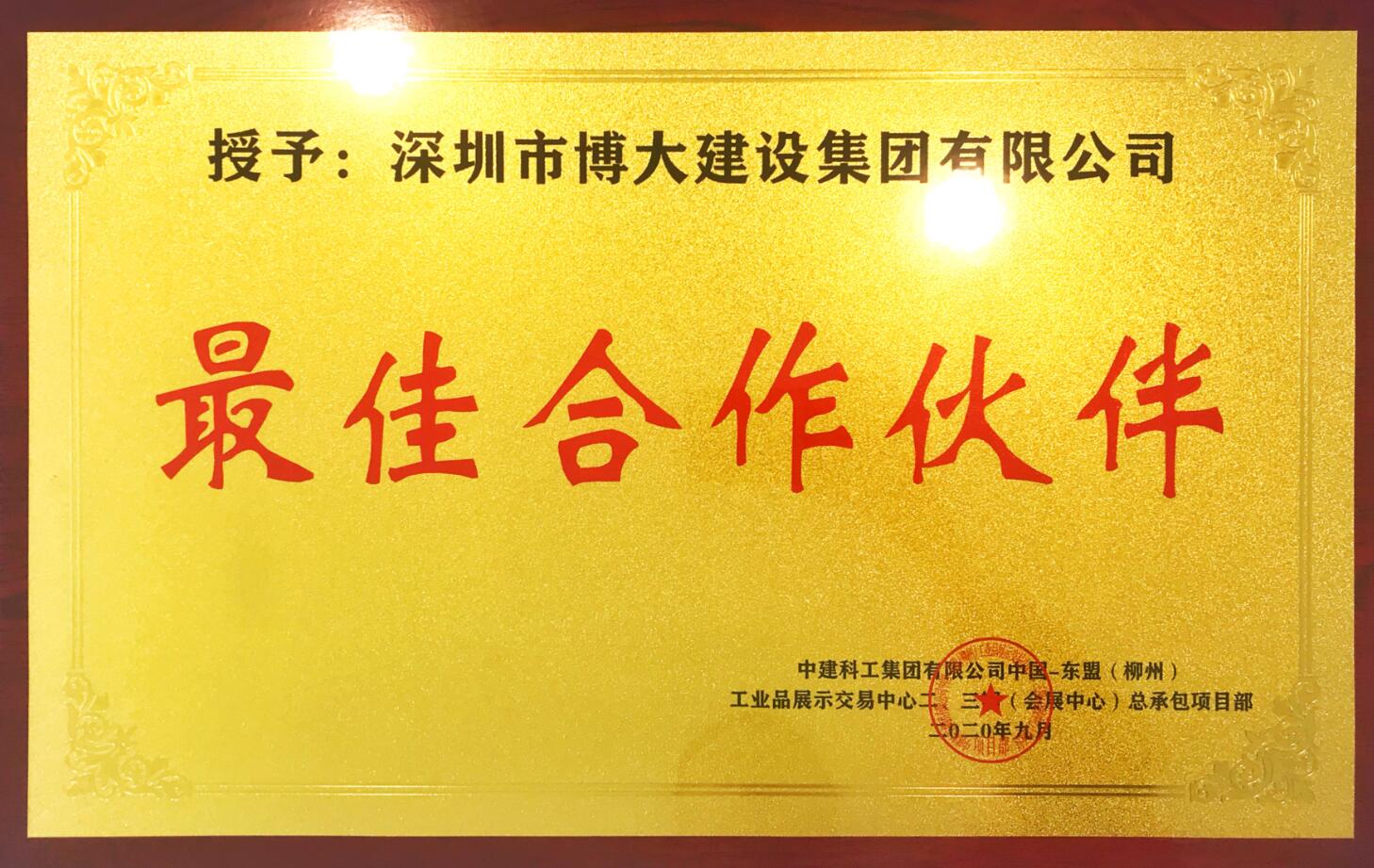 在中國—東盟(柳州)工業(yè)品展示交易中心項(xiàng)目建設(shè)中,博大人矢志不渝地踐行“讓顧客有幸福感”的企業(yè)魂,牢記“將履約視為生命”的莊嚴(yán)承諾,不講條件、全力以赴,最終以過硬的工程質(zhì)量、切實(shí)的工期保障、卓越的履約能力得到甲方的高度認(rèn)可,榮獲中建科工集團(tuán)有限公司頒發(fā)的“最佳合作伙伴”!